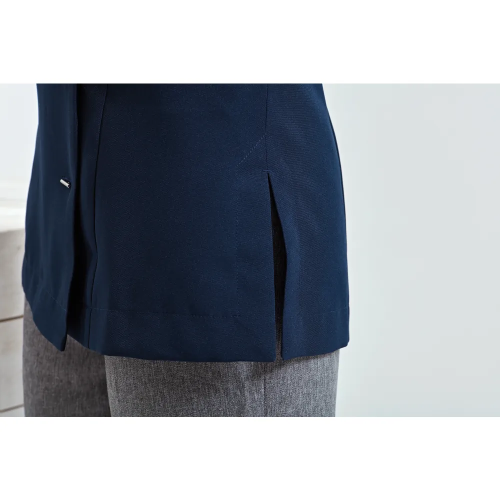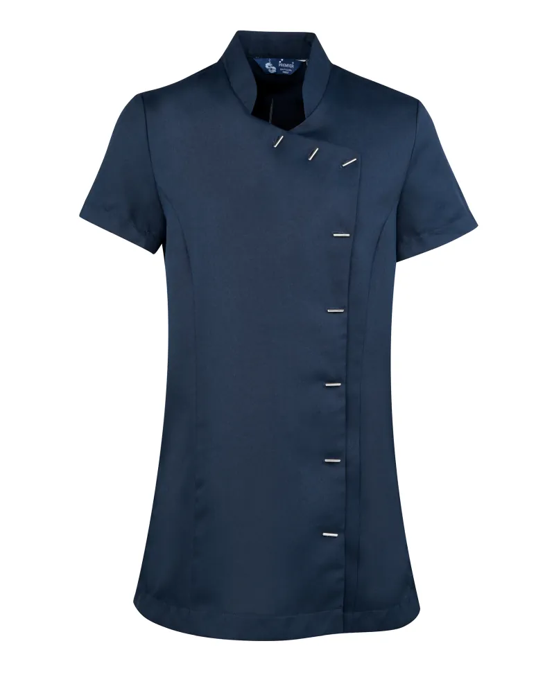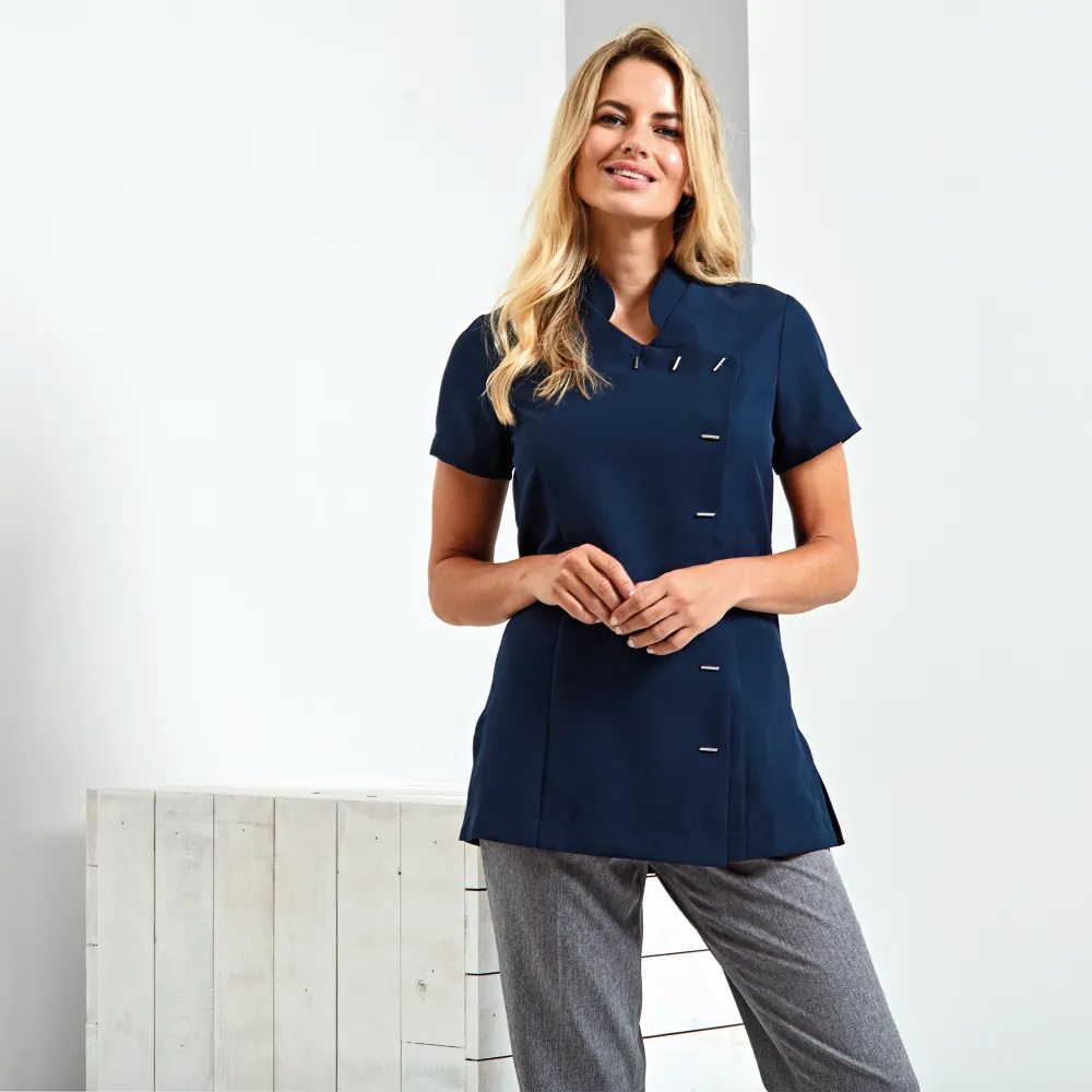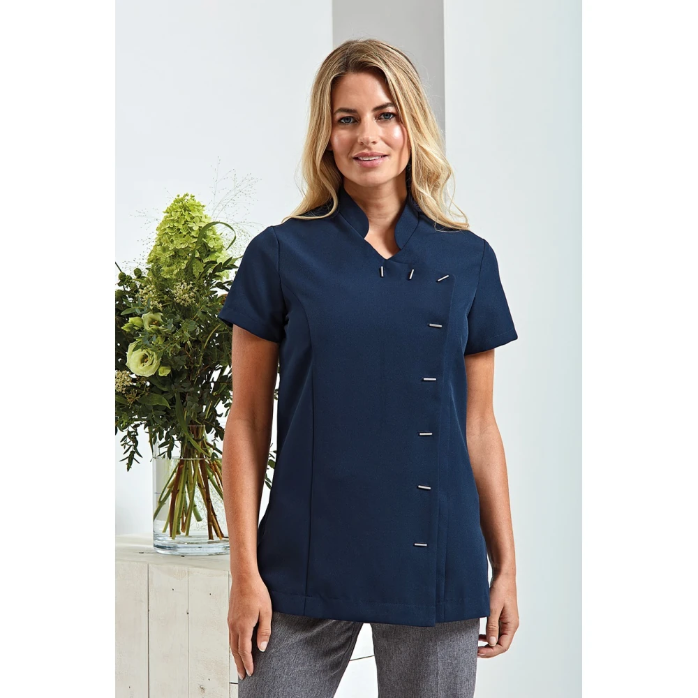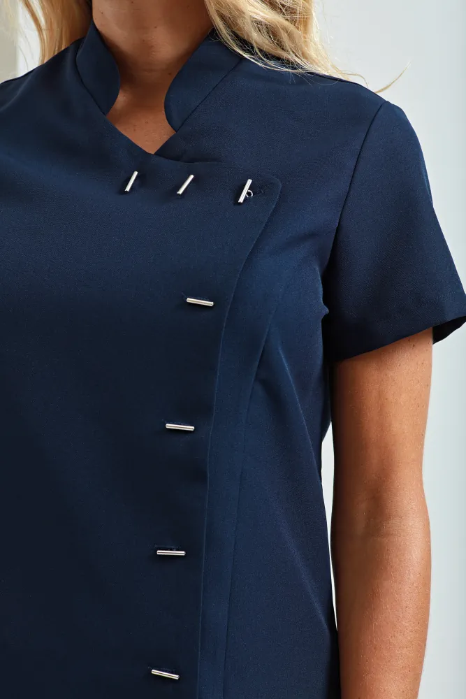 Κολακευτική γυναικεία εφαρμογή με μπούστο και πιέτες στην πλάτη - Γιακάς τύπου "μάο" - Κλείσιμο μπροστά με 8 μακρόστενα κουμπιά - Ραφές 'princess'