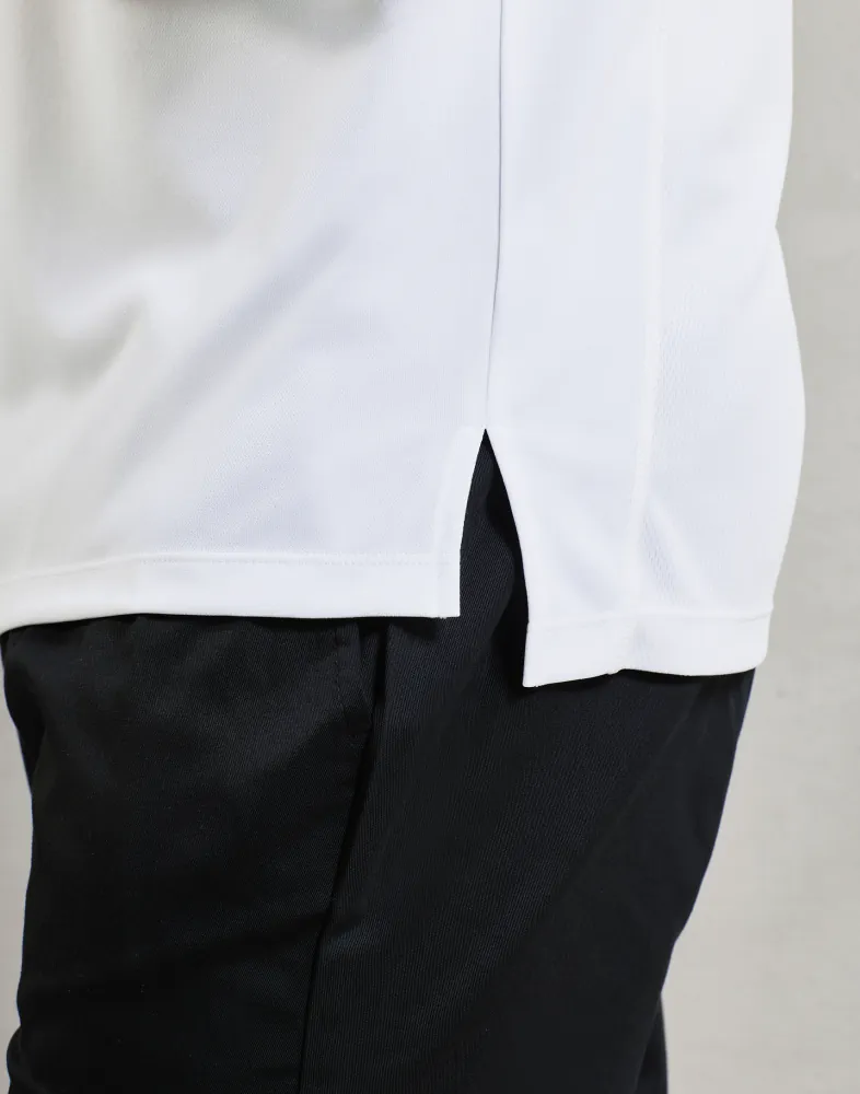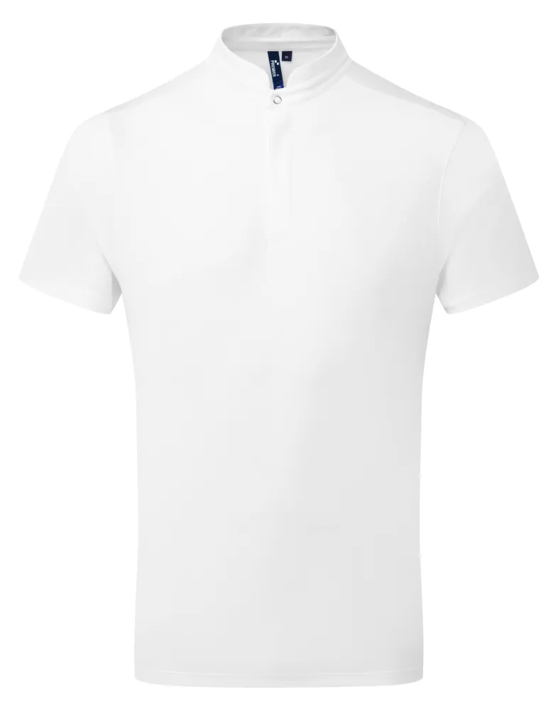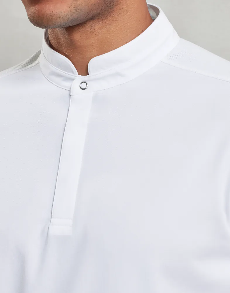 Κοντά μανίκια – Γιακάς τύπου μάο – Κρυφό κουμπί στο κολάρο – Τσέπη για στυλό στο αριστερό μανίκι – Πλαϊνά σκισίματα – Πλάτη από διαπνέον δίχτυ Coolchecker®